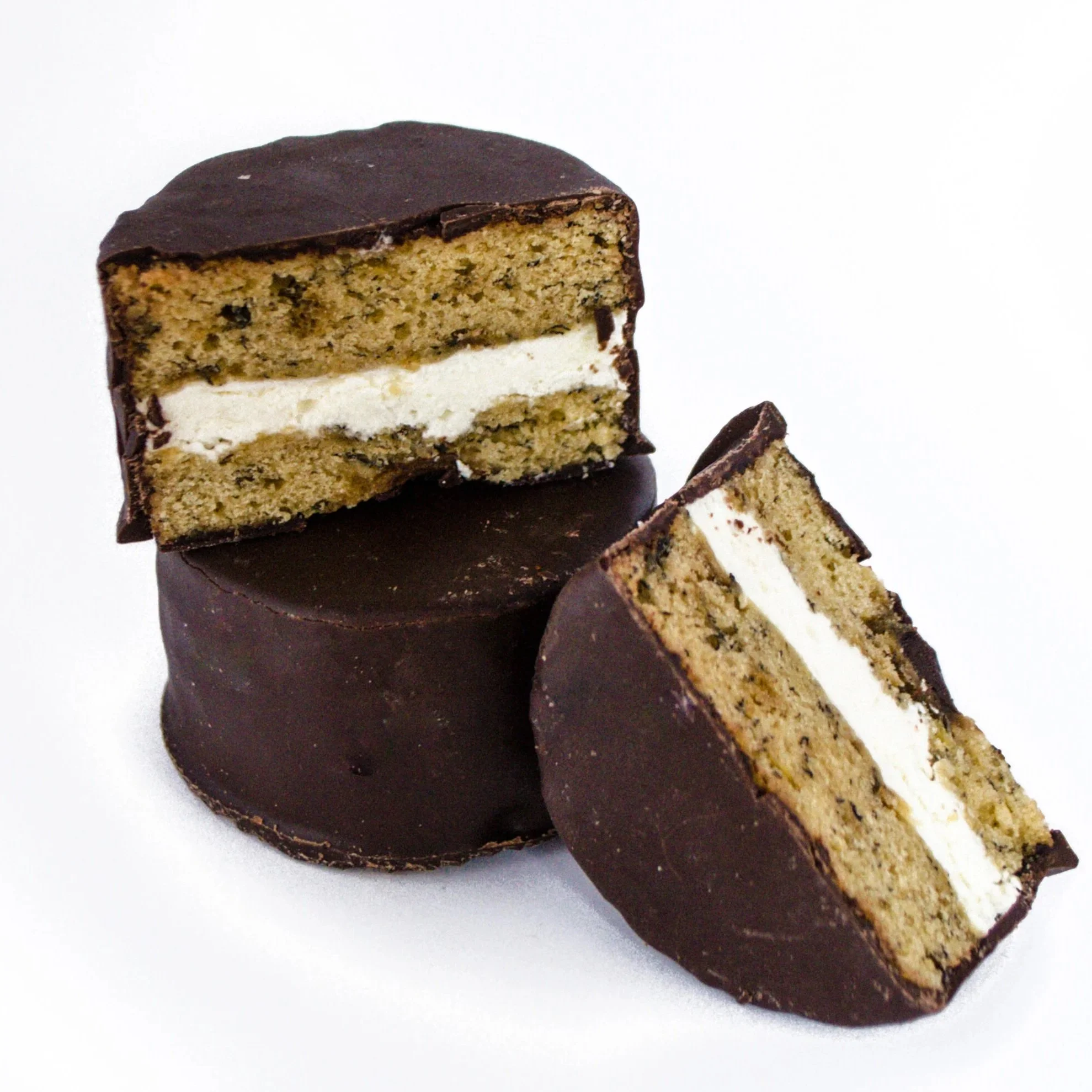 Our artisanal rendition of the classic 1950s snack cake. Tasty vanilla cream filling sandwiched between luscious chocolate cake, frozen in time in a dark chocolate shell. The one that started it all!